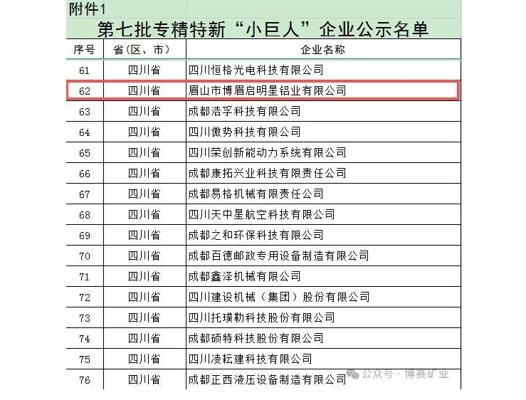 博眉啟明星鋁業有限公司榮獲四川省專精特新“小巨人”企業稱號